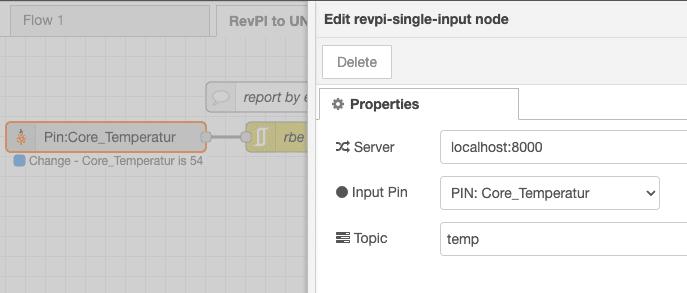In my example, the focus is on integration with a RevolutionPi. To achieve this, the FlowFuse Device Agent was deployed on a RevolutionPi (see our documentation), and specific RevolutionPi nodes were installed. These nodes enable direct interaction with all interfaces of the PLC and are available through the Node-RED library. Subsequent steps involved acquiring temperature data directly from the PLC.